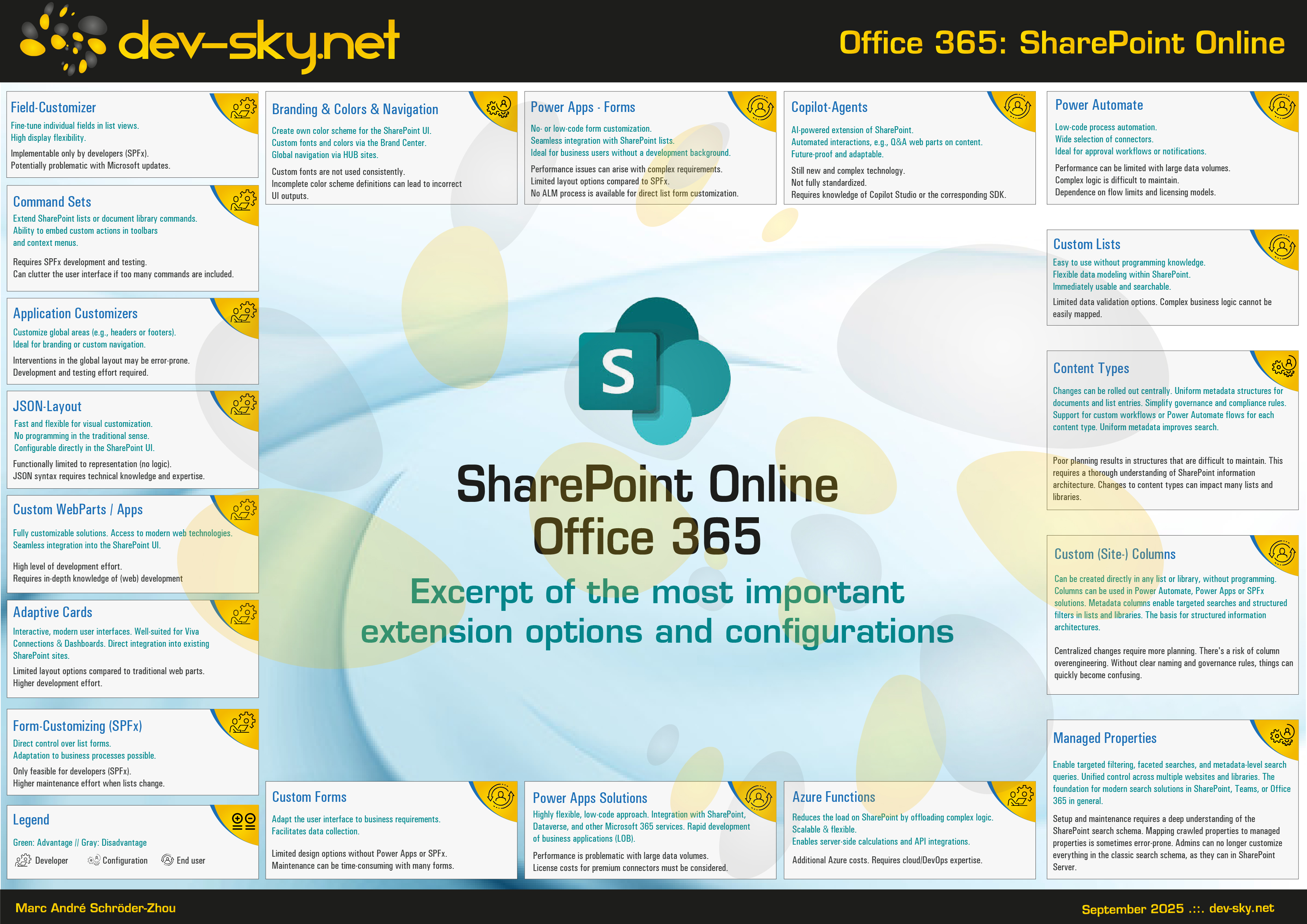 In this blog post I present my brand new overview poster about the possible extensions and customization options in SharePoint Online. During my workshops and discussions with my customers I received very often the following question: What can I do to bring my own functionality and logic to SharePoint online? Good question, isn't it?